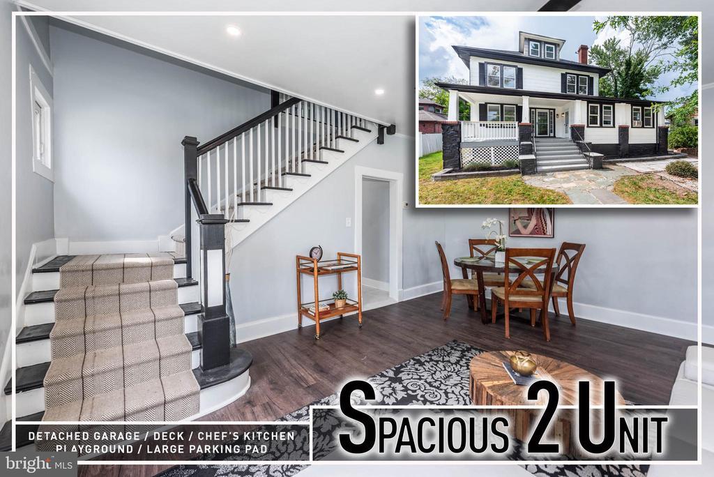 Experience comfort, flexibility, and income potential in this newly renovated, non-conforming 2-unit Colonial offering over 2,500 sq. ft. of thoughtfully designed living space! The expansive owner’s unit welcomes you with a light-filled living room that flows into a dining area—perfect for hosting holidays and family dinners. The gourmet kitchen is a true showstopper, featuring sleek Quartz countertops, custom cabinetry, and high-end appliances to inspire your inner chef. A convenient main-level half bath adds function, while upstairs you’ll find 5 bedrooms and 3.5 baths, including a dream-worthy Primary Suite with a custom walk-in closet, built-in organizers, and a spa-like bath with dual vanities and an oversized walk-in shower. The second unit offers its own inviting layout with warm wood laminate flooring, a comfortable living room, a sunny dining area, a fully equipped kitchen, a laundry room, and 3 spacious bedrooms with a full bath—ideal for extended family, guests, or rental income. Extra features include an unfinished basement for abundant storage, a rear deck for summer barbecues, a detached 2-car garage plus additional driveway parking, and a charming front porch overlooking a large yard with its very own play area. Whether you choose to live in one unit and rent the other, or simply enjoy the versatility for multi-generational living, this property offers endless possibilities—all just minutes from I-695, I-70, and Route 40 for quick access to shopping, dining, and commuter routes.
