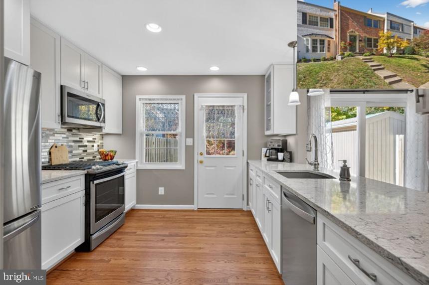This beautifully updated all-brick townhome offers classic style, modern upgrades, and an unbeatable location within the highly sought-after West Springfield High School pyramid. From the moment you step inside, you’ll notice the quality craftsmanship and attention to detail that make this home truly move-in ready. Gleaming hardwood floors flow throughout the main and upper levels, complemented by updated lighting and six-panel doors that give the home a fresh, timeless feel. The remodeled kitchen is a showstopper—featuring white Shaker-style cabinets, quartz countertops, recessed and pendant lighting, glass-front accents, and stainless steel appliances including a five-burner gas range, French-door refrigerator, built-in microwave, and a quiet dishwasher with a third rack. A thoughtfully enlarged opening between the kitchen and dining area enhances flow and natural light, making this space ideal for entertaining.